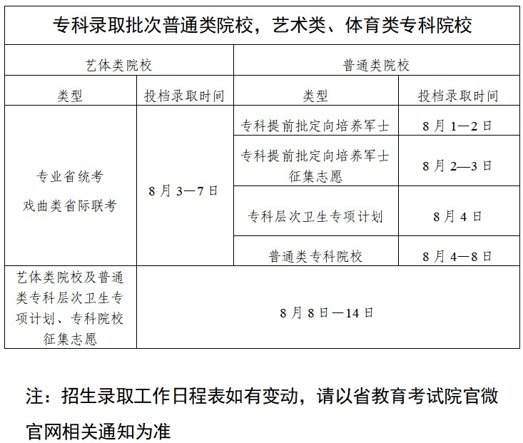 我省2025年高考志愿填报工作已经顺利结束,招生录取工作将于7月8日至8月14日进行。其中,本科提前批为7月8日至18日,本科批为7月17日至31日,专科批为8月1日至8月14日。工作日程后续如有调整,请以省教育考试院官微官网的最新通知为准。录取结果一般在该批次录取完成后的次日可查。